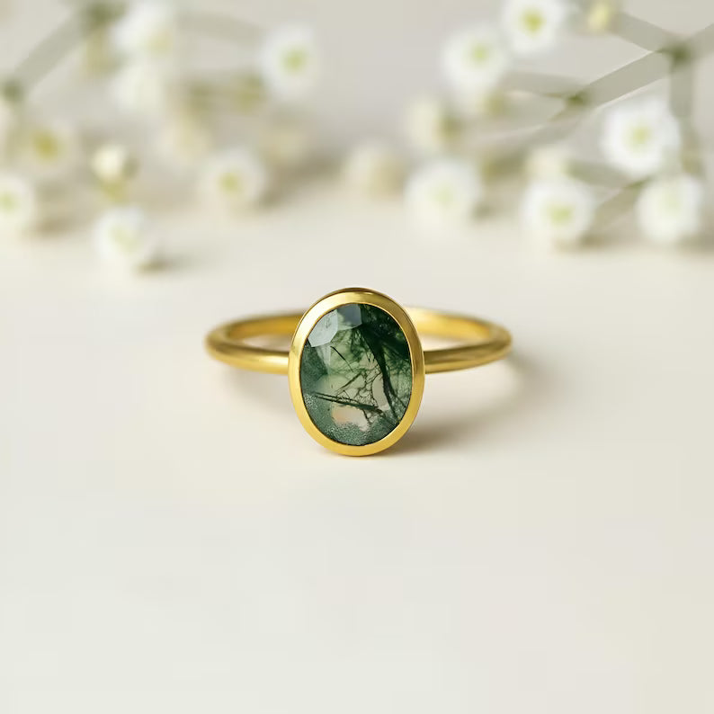 Unique moss agate engagement rings with nature-inspired, boho, and vintage designs—perfect for alternative bridal and everyday wear.