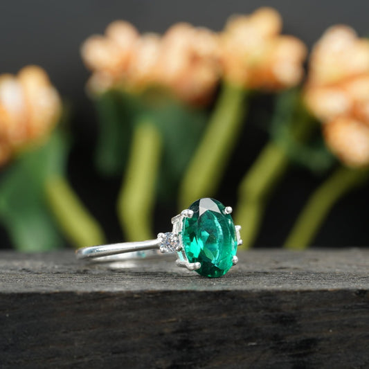 Oval Cut Emerald & Zirconia Three Stone Engagement Ring