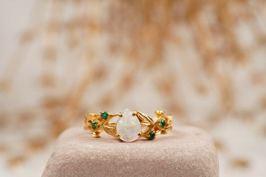 Nature Inspired Opal Engagement Ring Set With Leaf Emerald Band